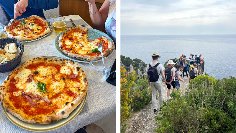 De to neste dagene var det Capri og Pompeii som sto for tur. Fra Sorrento er det kun en kort båttur over til den vakre, luksuriøse øya Capri. Vår lokale guide, som faktisk er bosatt på øya, guidet oss rundt i byen og på turstier, fortalte oss om øyas historie og funksjon, og viste oss fantastiske utsiktspunkt hvor det ikke var noen andre enn oss. Det hele ble avsluttet med en deilig pizzalunsj og litt egentid til å utforske øya, før vi tok båten tilbake til Sorrento igjen.