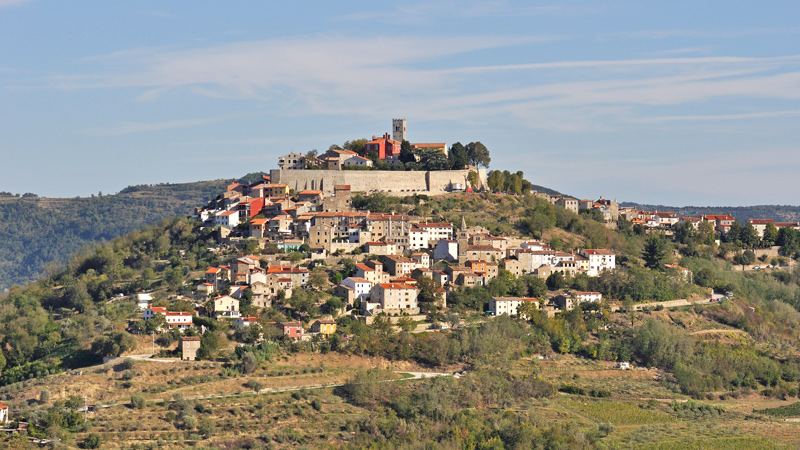 Fra Buje følger dere veien mot Groznjan. En typisk by beliggende på en høyde rett ved elven Mirna. Byen er blant annet kjent for sine barokke kirker St. Vitus og Modesto. Ta en vandretur i gatene og du vil finne at nesten hver eneste dør fører inn til et kunststudio eller galleri. Og fra hvert vindu hører du toner fra ulike musikksjanger, fra klassisk til jazz. Byen er kjent som «Kunstnerbyen». Videre på rolige veier til Oprtalj. Videre ruller dere nedover med utsikt over elven Mirna. Til slutt kommer dere til Livade, kjent som trøffelsenteret i Istria. Overnatting i Motuvun.