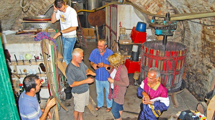 Tilbake til denne vanlige sykkeldagen for 12 år siden; Sammen med 20 småsvette sykkelvenner tar vi en vannpause på bakketoppen, tett ved solmodne vinranker vis-a-vis inngangen til en unnselig liten gård. Ut av porten kommer en middelaldrende kvinne for å bli kvitt et par søppelposer. Jeg spør henne om vindruene tilhører hennes gård.