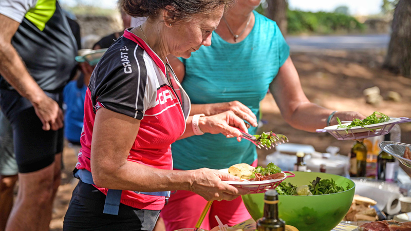 Når vi har syklet noen kilometer eller mil, og vi ser følgebilen stå der fremme med bakluken oppe, da er det servering å få. Frukt, nøtter, bær, skinke, chorizo.