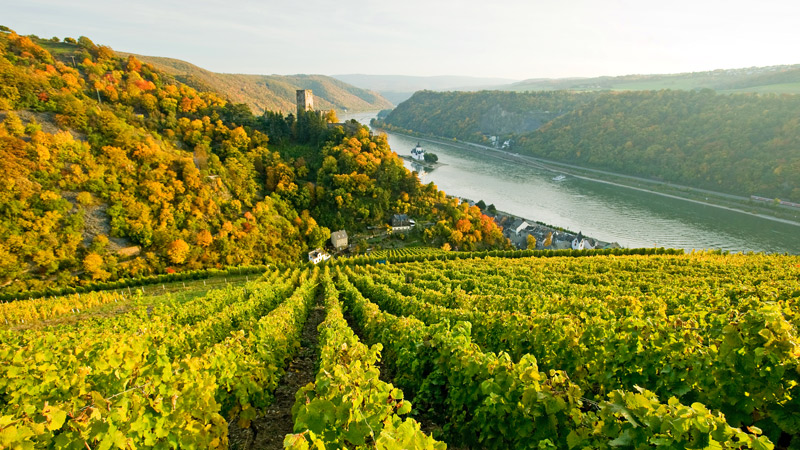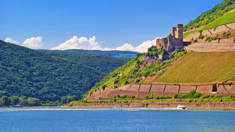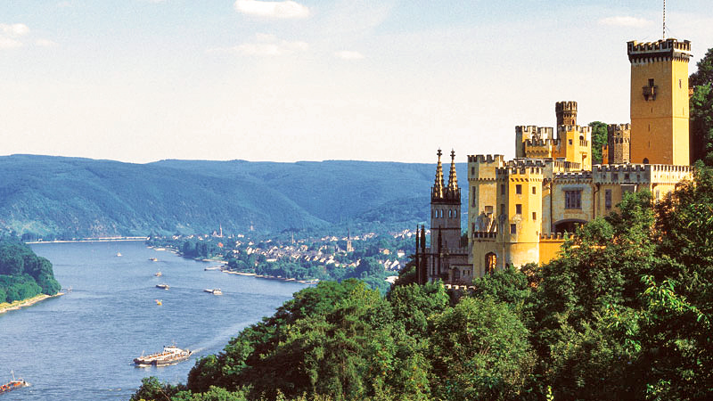 Sykkelturen i dag går langs Rhinen, og sjarmerendevinbyer og fantastiske utsikter venter på deg. Etter at du har passert den pittoreske byen Eltville, kommer du til den verdensberømte vinbyen Rüdesheim am Rhein. En avstikker til Niederwald-monumentet med stolheisen anbefales på det sterkeste. Utsikten fra toppen er fantastisk. Bak Rüdesheim bytter du til den andre siden av elven. Snart ser du allerede Kaub med sin nesten 700 år gamle tollborg, som ligger på en liten øy midt i Rhinen. Turen fortsetter gjennom UNESCOs verdensarvområde «Øvre midtre Rhindal». Kulturlandskapet er preget av vindyrking. Tils Oberwesel. Den lille byen har fortsatt deler av bymuren med 16 forsvarstårn. Middelalderslottet Schönburg ligger høyt oppe på dalstien. De mange vintavernaene inviterer til et glass vin og smakfulle spesialiteter fra regionen.