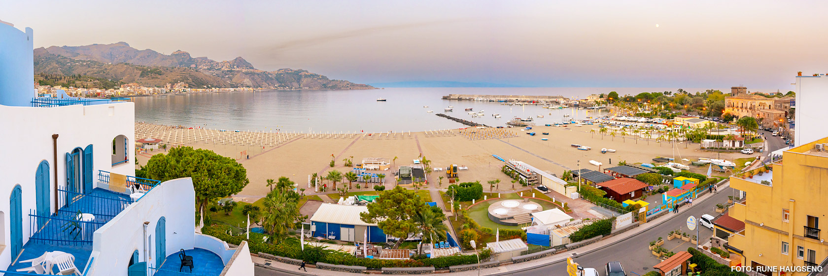Noen få km seinere inntas Giardini Naxos med sine forlokkende strender. Dette er et av turens høydepunkt, og er et svært godt sted å være; svært overkommelig i størrelse, utsøkt sjømat (spagetti alla vongole!), herlige bademuligheter hele året og en hyggelig kveldsatmosfære.